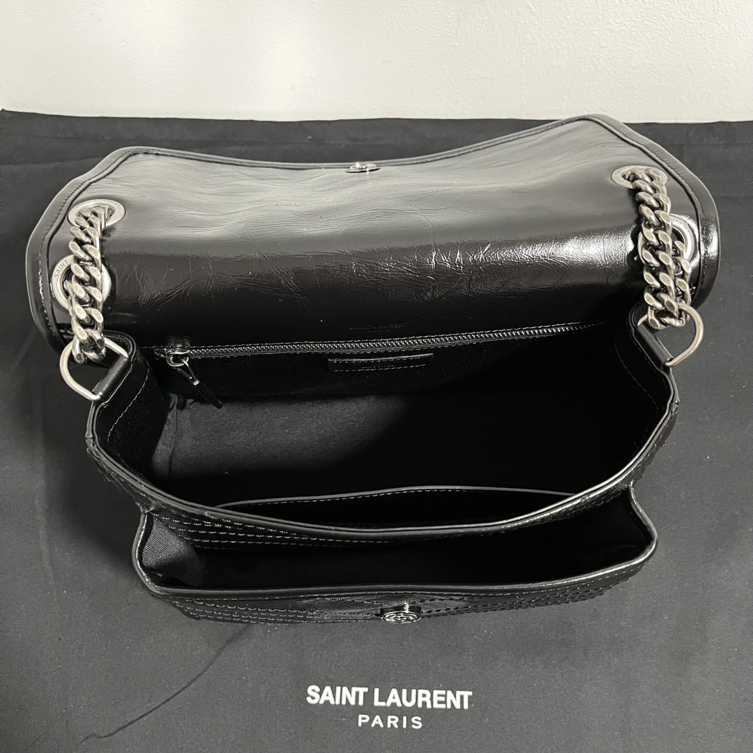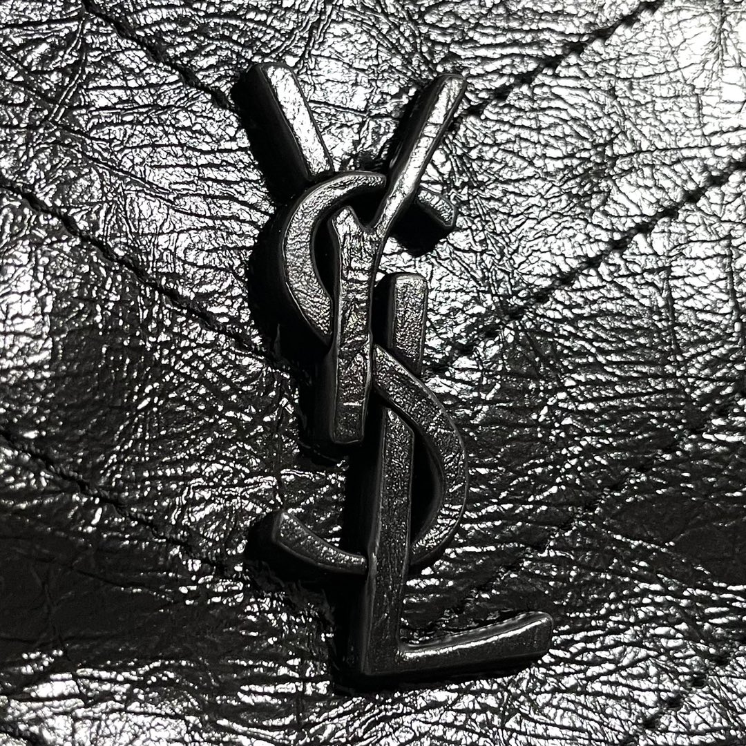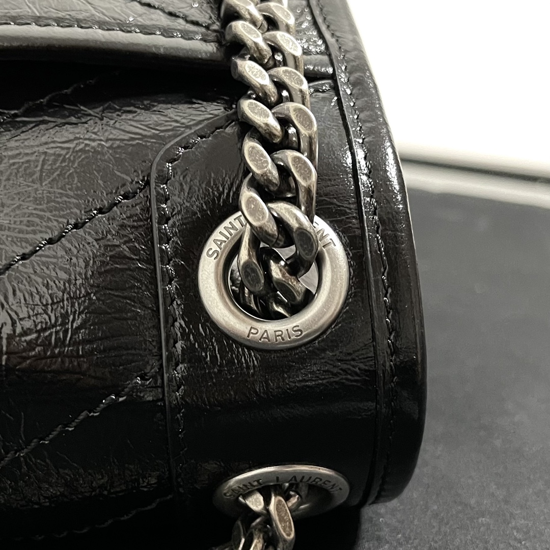 Saint Laurent Black Monogram Niki Medium Bag with Black Chain Strap in Crinkled Vintage Leather Black 생로랑 크링클 빈티지 레더 블랙 모노그램 니키 미디움백 블랙 체인 스트랩 블랙Contact(KAKAO TALK)(ZALO CHAT)