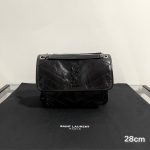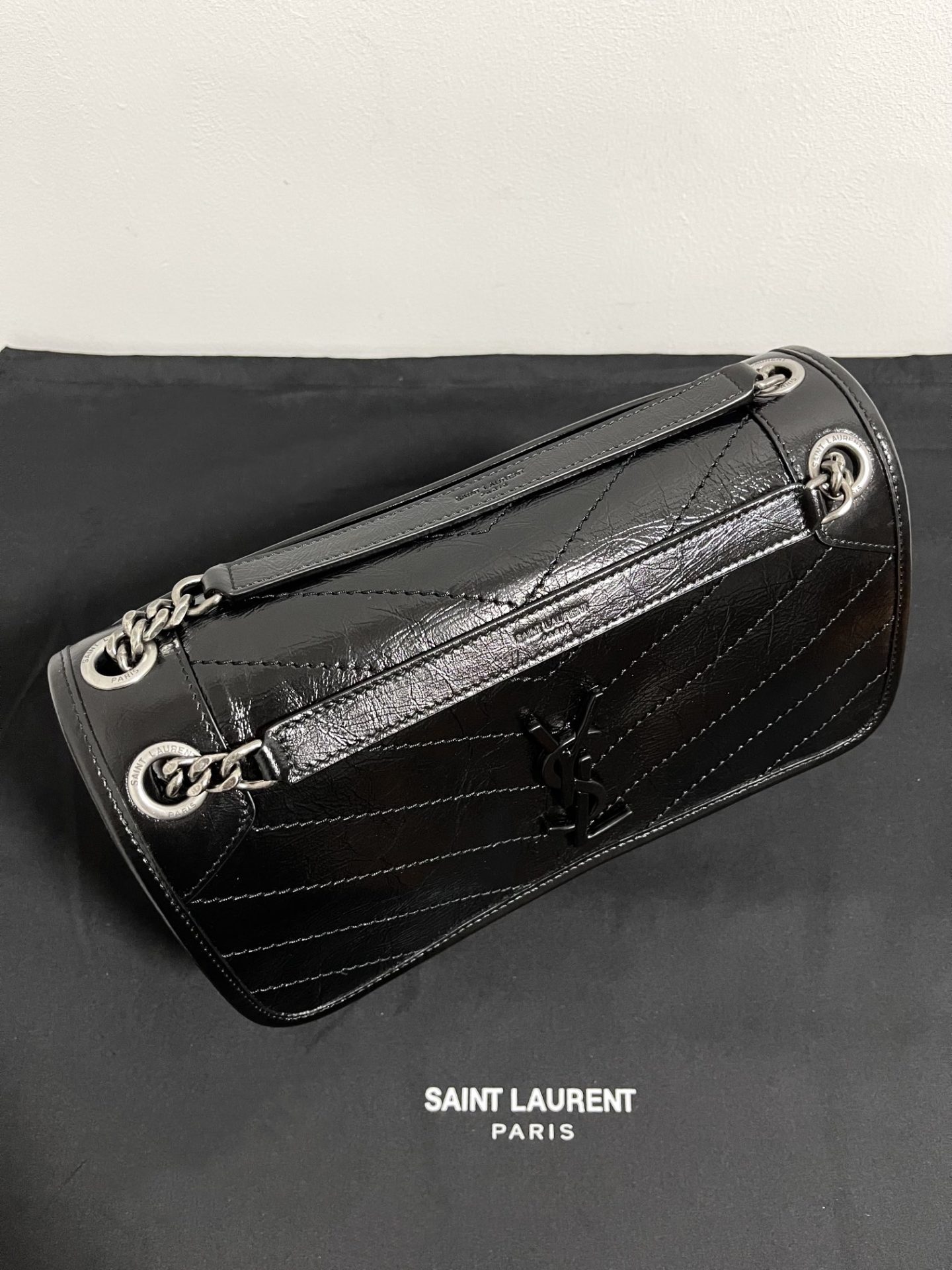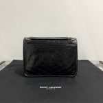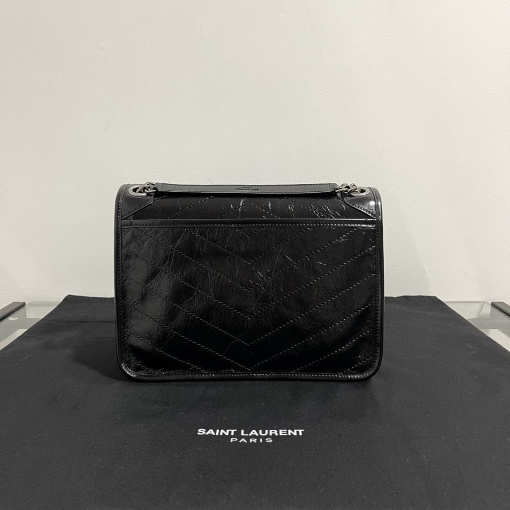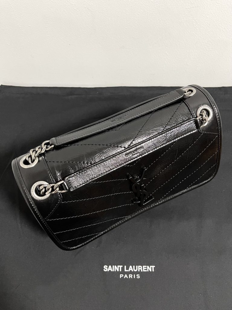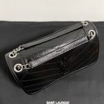 Saint Laurent Black Monogram Niki Medium Bag with Black Chain Strap in Crinkled Vintage Leather Black 생로랑 크링클 빈티지 레더 블랙 모노그램 니키 미디움백 블랙 체인 스트랩 블랙Contact(KAKAO TALK)(ZALO CHAT)